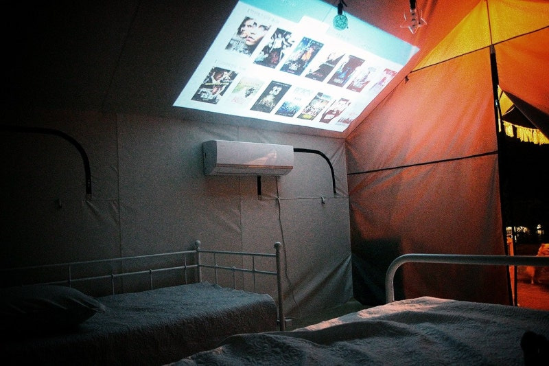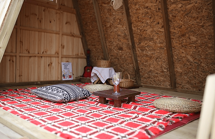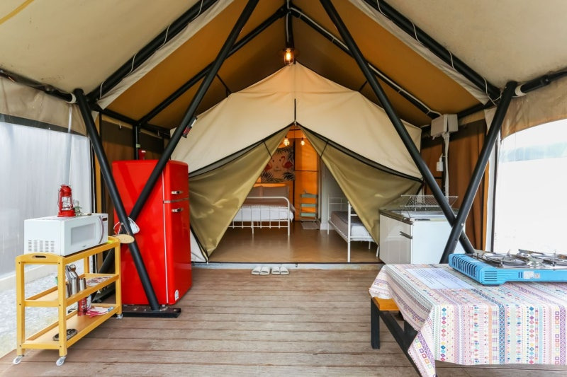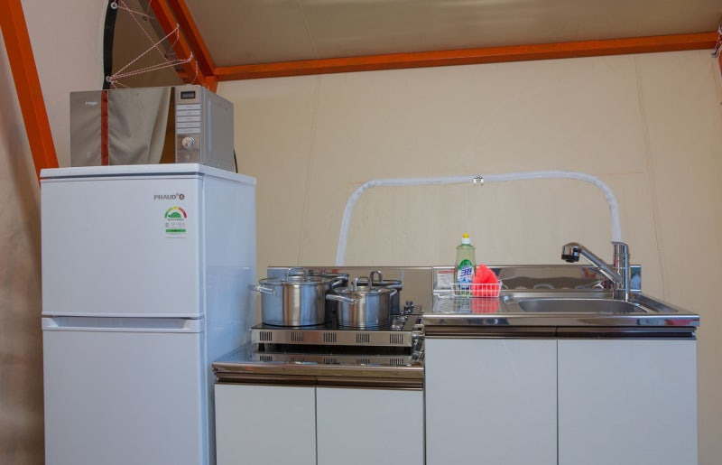 이와 함께 개별 욕실과 주방 공간도 야무지게 갖춰 놨어요. 냉장고부터 에어컨, 식탁, 각종 취사 및 식기류까지 없는 게 없어요. USB를 챙겨오면 빔 프로젝터로 영화 시청도 가능해요. 캠핑장에서는 고기를 포함한 바비큐 세트를 주문하거나 보드게임, 배드민턴 등을 빌릴 수 있어요. 캠프파이어도 놓치지 마세요.