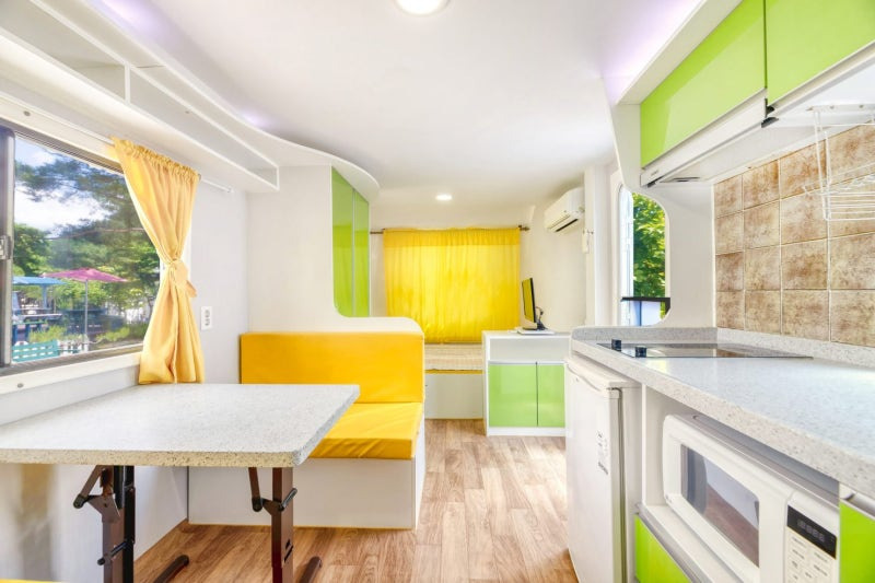 같은 카라반이라도 디자인과 인테리어 소품이 각각 달라요. 나만의 개성이 중요한 분들에게는 안성맞춤인 경기도 캠핑장 추천 숙소겠죠? 어디서 찍어도 인생샷은 보장한답니다. 객실에는 침대와 냉난방 기구, 각종 취사도구를 완비했어요. 카라반 앞 개별 데크에서 얼마든지 취사 가능해요. 숯과 그릴도 대여할 수 있으니 BBQ도 즐겨보시와요.