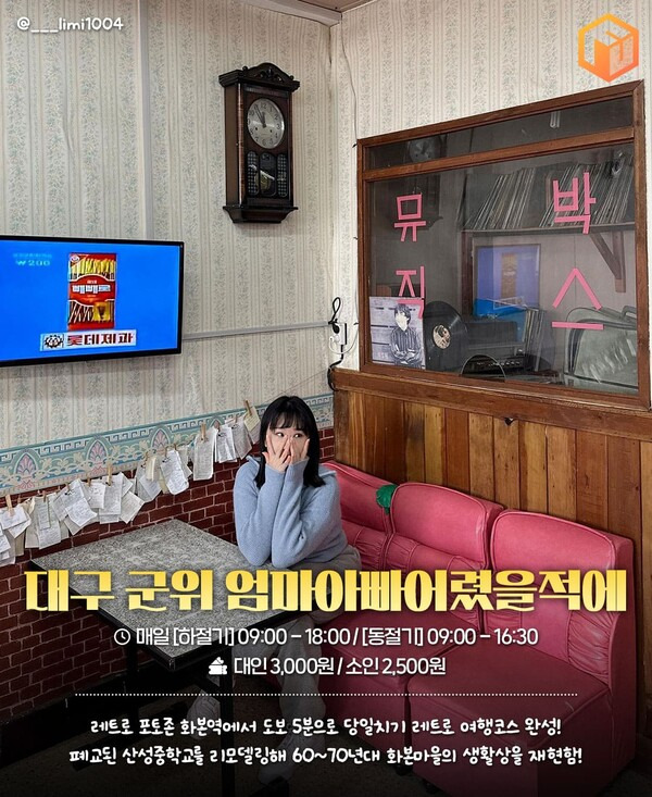 대구 군위는 한가롭고 아기자기한 포토존이 많아 당일치기 여행지로 각광받는 지역입니다. 가장 유명한 '화본역'은 레트로한 간판이 특징인 간이역인데요. 화본역에서 도보 5분 거리, 1960~70년대 화본마을의 생활상을 전시하고 있는 '엄마아빠어렸을적에'가 위치해있습니다.