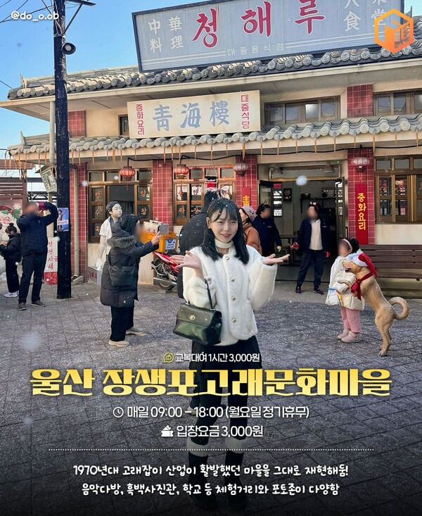 울산 장생포 고래문화마을은 국내 유일 고래 관광도시의 체험지 중 하나로, 1970년대 고래잡이 황금기였던 울산의 어촌동네를 통쨰로 재현해둔 레트로 여행지입니다. 마을 내에서는 흑백사진관, 학교, 선장님 집, 우체국 등의 공간을 드나들며 오감으로 그 시절을 체험해볼 수 있습니다.
