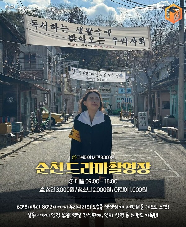 순천 드라마촬영장은 국내 최대 규모의 드라마·영화 세트장으로 3가지 테마로 공간이 조성되어 있습니다. 60년대 순천 읍내거리, 70년대 서울 봉천동의 달동네, 80년대 서울 변두리 동네의 거리 등 대규모의 야외 세트장이죠. 근현대시기 우리나라의 풍경이 완벽하게 재현되어 있는만큼 80여편의 드라마·영화가 이곳에서 촬영되기도 했습니다.