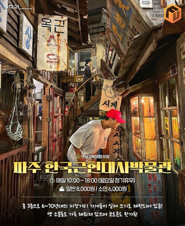 파주 근현대사박물관은 실내 레트로 여행지로, 30년간 모아온 7만 여 점의 유물 자료가 가득 펼쳐지는 공간입니다. 1960~90년대의 한국 생활상이 지하 1층부터 3층까지 빈틈없이 재현되어 있는데요. 어제까지도 운영된듯한 우체국, 전파사, 이발소 등을 실제 크기로 생생하게 관람할 수 있습니다.