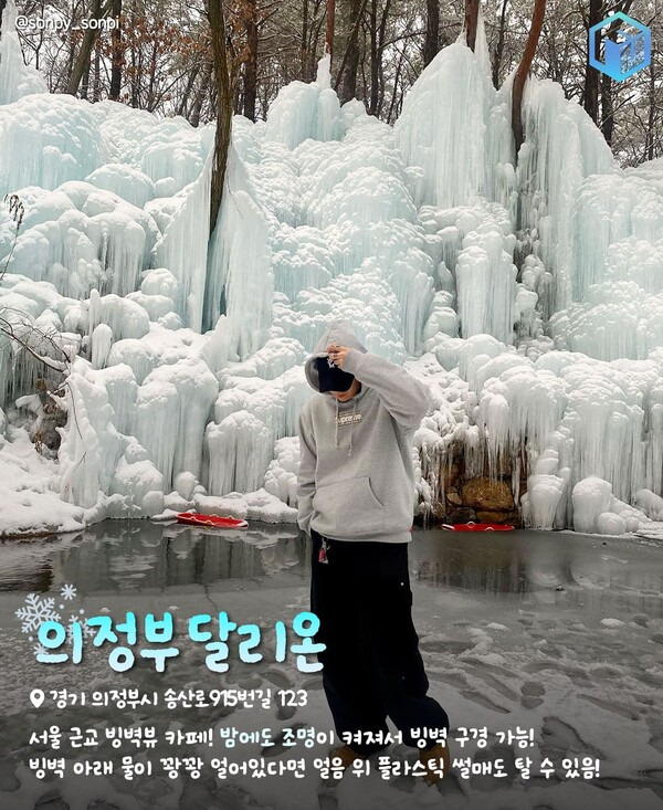 서울에서 가장 가까운 곳에 위치한 빙벽 명소, 의정부 달리온 카페입니다. 겨울에는 빙벽으로, 가을에는 단풍 명소로 나들이객의 발걸음이 끊이지 않는 대형카페인데요. 계곡의 물을 이용해 만들어진 달리온의 인공 빙벽은 오묘한 푸른 빛을 띄고 있습니다.