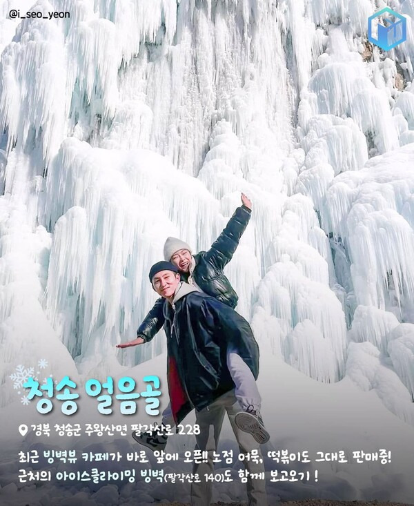 청송 얼음골은 절벽 아래 응회암 바위들이 쌓여있어 웅장하고 이국적인 풍경이 펼쳐지는 빙벽 명소입니다. 두터운 절벽을 따라 매년 겨울, 아이스크림 '뽕따'를 연상케하는 빙벽이 형성되어 SNS상으로 빠르게 유명해진 곳이죠. 청송 얼음골은 가까운 위치에 두 곳이 형성되어 있습니다.