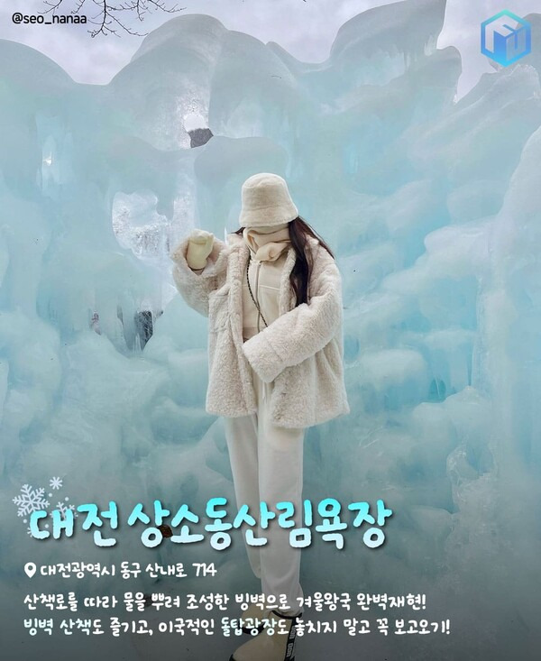 대전 상소동산림욕장은 사계절 내내 무료로 개방되는 산림욕장입니다. 이국적인 돌탑광장과 청명한 자연 속 산책로 등으로 사계절 많은 분들이 찾는 대전의 대표 여행지 중 하나이기도 하죠. 푸릇함으로 가득했던 상소동산림욕장의 산책로는 매년 겨울, 하늘빛의 빙벽으로 둘러쌓입니다.