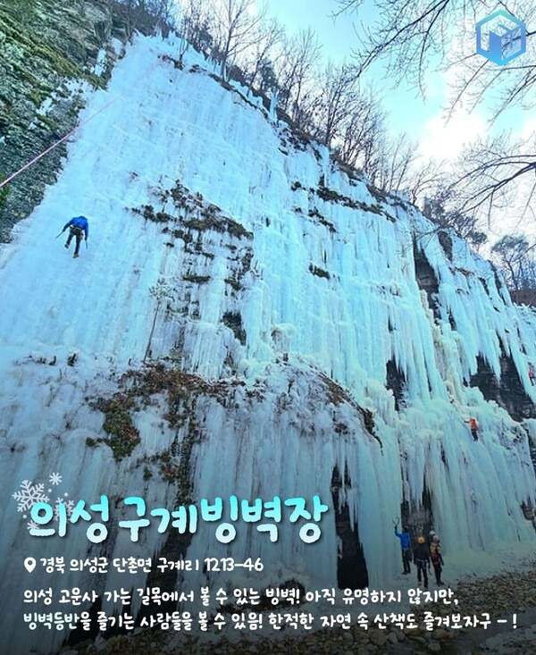 햇빛 반대방향의 절벽을 따라 형성되어 있어 빙벽이 잘 녹지 않아 높은 확률로 빙벽 등반을 즐기는 분들을 감상할 수 있는데요. 산길을 따라 고운사까지 방문해 겨울 자연의 정취를 만끽하기 좋은 빙벽 명소입니다.