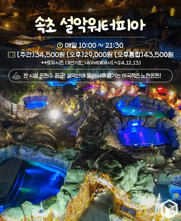 겨울에는 눈 쌓인 설악산을 감상하며 따뜻한 스파를 즐길 수 있는 노천온천 설악 워터피아입니다. 2만 4천평의 대규모 온천복합시설 전역에 100% 천연 온천수가 공급되고 있는데요. 설악 워터피아의 온천수는 관절염과 피부미용에 특히 효과가 좋은 것으로 알려져 있습니다.