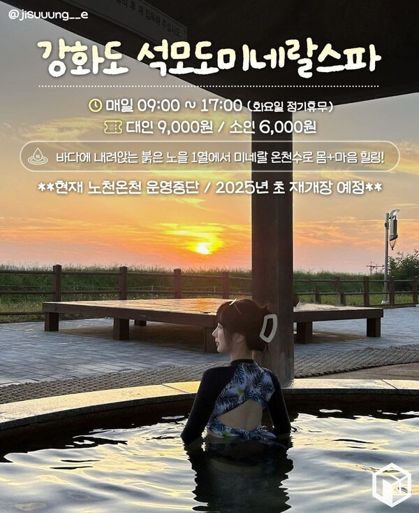 서해바다의 지평선을 넘어가는 석양을 감상하며 온천을 즐길 수 있는 강화도의 석모도 미네랄스파입니다. 늦은 오후, 노천 스파 시설에서는 바닷바람과 햇빛을 느끼며 51℃ 고온의 미네랄 온천수가 공급되는 탕에서 온전히 힐링을 만끽하기 좋은데요.