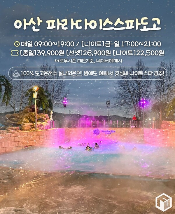 야외에는 온수 파도풀, 유수풀, 독특한 이벤트탕 등이 마련되어 있으며 최근 일부 시설 리뉴얼을 거치며 더욱 쾌적한 시설이 특징입니다. 겨울 밤 매주 금, 토, 일 및 공휴일에는 오후 5시부터 9시까지 이용 가능한 '나이트스파권'을 판매하기도 하는데요. 추운 겨울, 눈으로 덮인 자연이 따뜻한 온천수와 조명과 어우러져 낭만적인 야간 노천온천탕을 합리적인 가격으로 이용할 수 있습니다.
