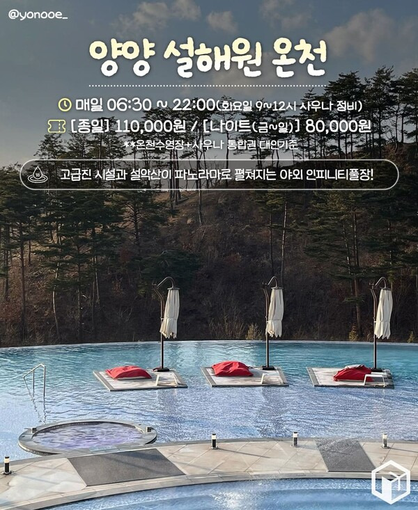 강원도 양양의 설해원 온천사우나는 럭셔리한 시설과 환상적인 설악산뷰를 감상하며 힐링하기 좋은 노천온천입니다. 최고 수질의 설해 온천수가 공급되는 설해원의 온천사우나공간은 투숙객이 아니더라도 이용이 가능한데요. 종일권은 대인 11만원, 소인 8만원의 가격으로 다소 높은 편입니다.