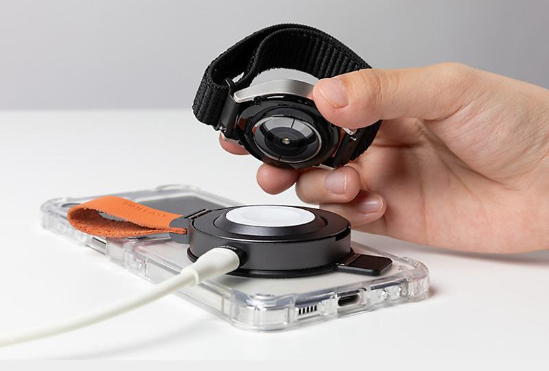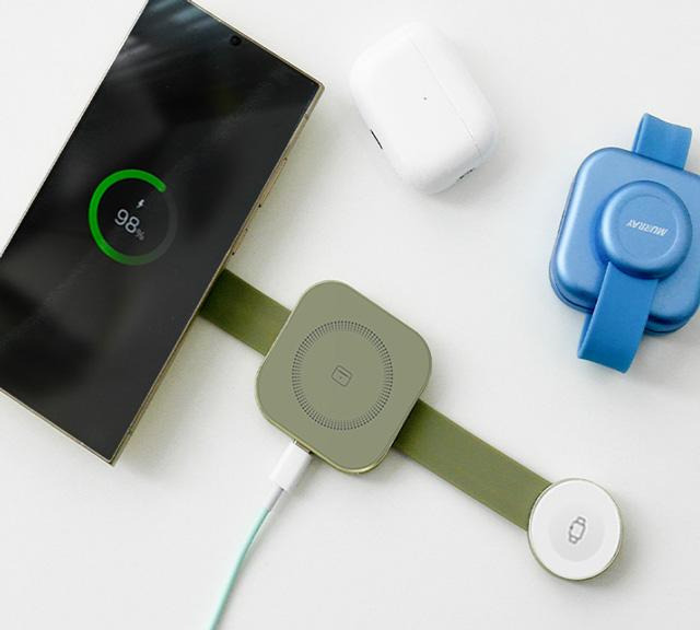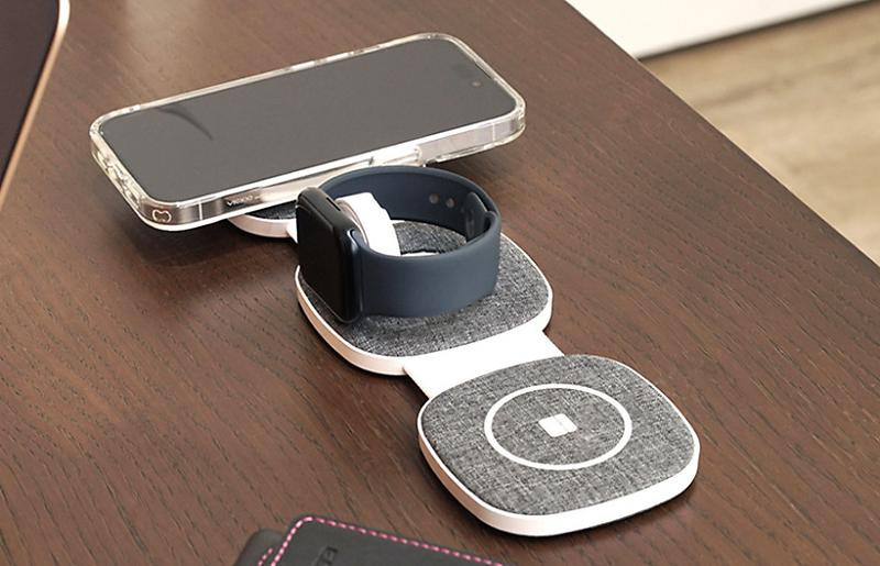 선충전기 DUAL-TAP'은 애플 아이폰 혹은 안드로이 드 스마트폰의 구분 없이 활용할 수 있는 다용도 제품 이다. 스마트워치, 무선 이어폰, 스마트폰의 세 종류 의 디바이스를 한 번에 충전할 수 있는 멀티 충전기 로, 25W 이상의 충전 어댑터와 케이블을 이용할 시 에는 고속 충전도 지원된다. 접었을 때는 에어팟 프로