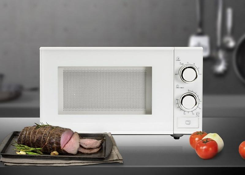 쿠오레 전자레인지 또한 20리터의 내부 용량을 갖춘 무회전 전자레인지 제품이다. 최대 출력은 700W를 지원하며, 출력은 5단계로 조절할 수 있다. 듀얼 다이 얼 방식인데, 상단의 다이얼로는 출력의 세기를 조절 할 수 있으며 하단 다이얼로는 타이머를 설정할 수 있 다. 우측에는 가벼운 도어 핸들을 적용해, 쉽게 문을 여닫을 수 있다. 블랙과 화이트의 두 가지 색상을 선 택할 수 있다. 본 제품의 온라인 최저가는 117,500원 으로 확인된다.