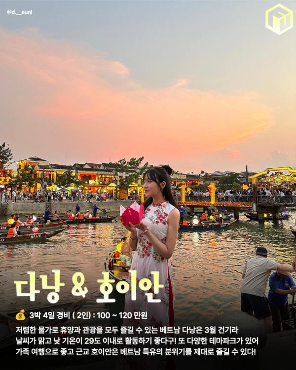 직항 기준 비행시간 약 4시간 30분 저렴한 물가로 휴양과 관광을 모두 즐길 수 있는 베트남 다낭은 3월 건기시즌 맑고 낮 기온이 29도 이내로 여행을 즐기기 좋은데요.