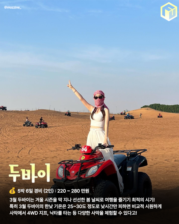 3월 두바이는 겨울 시즌을 막 지나 선선한 봄 날씨로 여행을 즐기기 최적의 시기인데요. 특히 3월 두바이의 한낮 기온은 25~30도 정도로 낮시간만 피하면 비교적 시원하게 사막에서 4WD 지프, 낙타를 타는 등 다양한 사막을 체험할 수 있습니다.