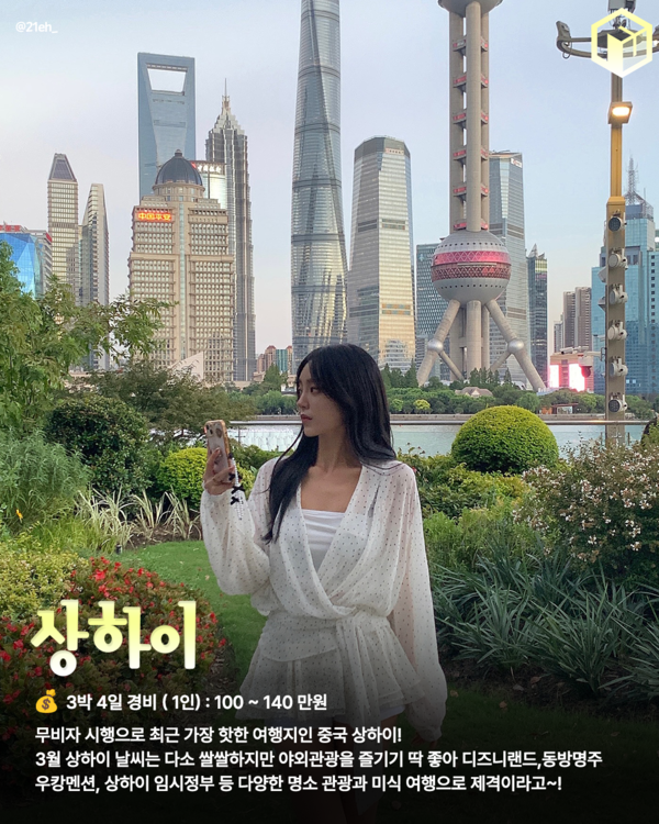 무비자 시행으로 최근 가장 핫한 여행지인 중국 상하이는 3월 다소 쌀쌀하지만 야외관광을 즐기기 딱 좋은 계절인데요. 중국의 현재를 만나볼 수 있는 동방명주, 와이탄 중국식 정원 예원등 중국의 과거와 현재를 볼 수 있어 흥로운 여행지입니다.