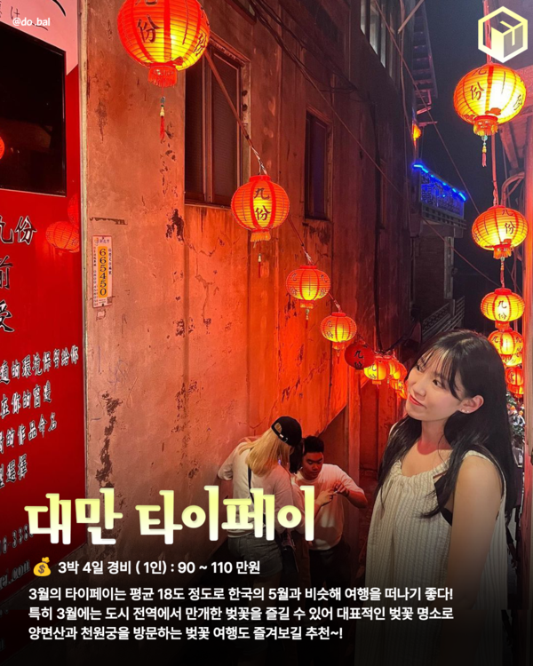 3월의 대만 타이페이는 평균 18도 정도로 한국의 5월과 비슷해 여행을 떠나기 좋은 시기입니다. 특히 3월 대만은 벚꽃 시즌으로 도시 전역에서 만개한 벚꽃이 어우로져 한층 활기 찬 분위기를 형성합니다.