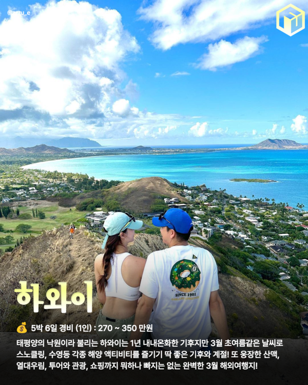 대자연 속 하와이는 눈이 아플정도로 푸른 에메랄드빛 해변을 바라만 봐 좋으며, 웅장한 산맥을 따라 트레킹, 열대우림 투어와 관광 그리고 쇼핑까지 뭐하나 빠지는 없는 완벽해 추천드리는 3월 해외여행지입니다.