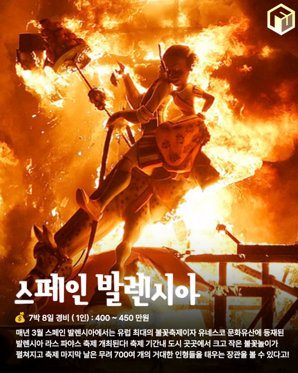 축제 기간내에는 도시 곳곳에서 크고 작은 불꽃놀이가 펼쳐지며 축제 마지막 날은 퍼레이드에 등장한 700여 개의 거대한 인형들을 불에 태우는 것이 전통이자 하이라이트라니 3월 스페인을 방문해 보시는 건 어떠신가요?