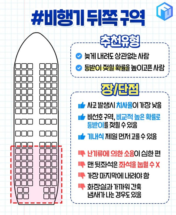 비행기 뒤쪽 구역의 좌석은 많은 사람들이 기피하곤 하는데요. 덕분에 비수기에는 좌석이 많이 비어 짐칸이 여유롭고 편하게 좌석을 눕히고 있을 수도 있습니다. 비행기 사고 발생 시 항공기 뒤쪽의 치사율이 가장 낮다는 조사 결과가 있기도 합니다.