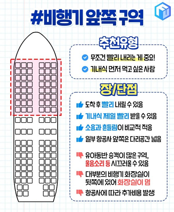 앞쪽 좌석 중에서도 맨 앞자리는 다리 공간이 넓어 비교적 편안하지만 항공기별로 팔걸이가 고정되어 있는 경우가 있어 오히려 불편함을 느끼는 분들도 많습니다. 일반적으로 맨 앞자리는 영유아를 동반한 승객이 탑승해 아이들의 울음소리 등 소음이 많이 발생합니다.