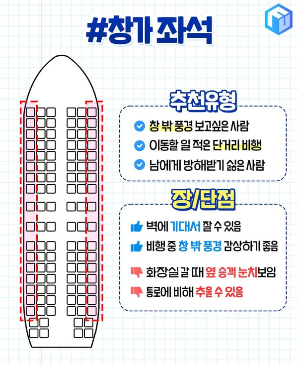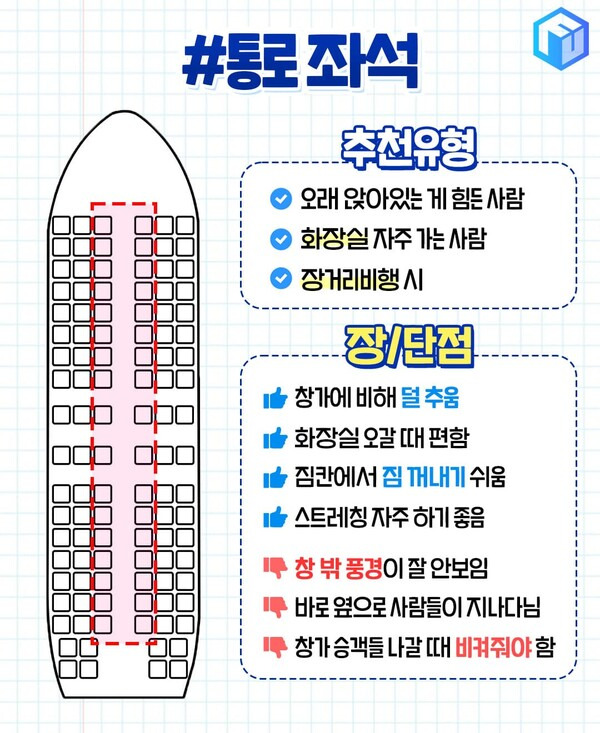 다만 화장실 이용 등의 이유로 이동시마다 옆좌석 승객에게 양해를 구해야 한다는 단점이 있어 장거리 비행시에는 추천하지 않습니다. 오랜 비행 시간에 마음 놓고 단잠을 자는 승객에게 약간의 눈치가 보일 수 있기 때문이죠. 또 창가 좌석은 에어컨의 영향으로 통로에 비해 춥게 느껴지는 것 또한 단점이 될 수 있겠죠.