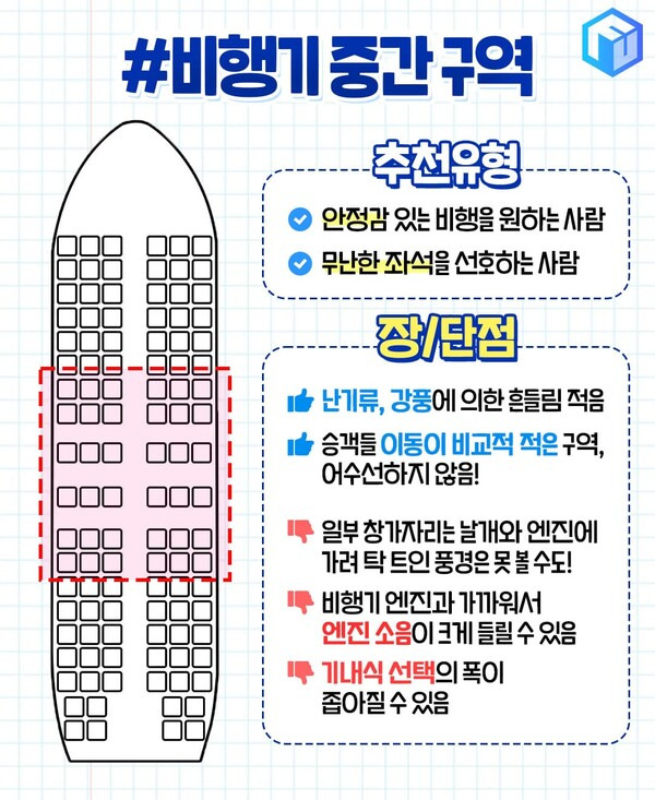 가장 많은 사람들이 탑승하는 비행기의 중간 구역입니다. 난기류 또는 강풍에 의한 기체 흔들림이 적게 느껴지는 구역으로 안정감있는 비행을 선호한다면 추천하는 구역인데요. 앞쪽과 뒷쪽 구역에 비해 승객 간의 이동이 적어 어수선한 분위기가 덜하기도 합니다.