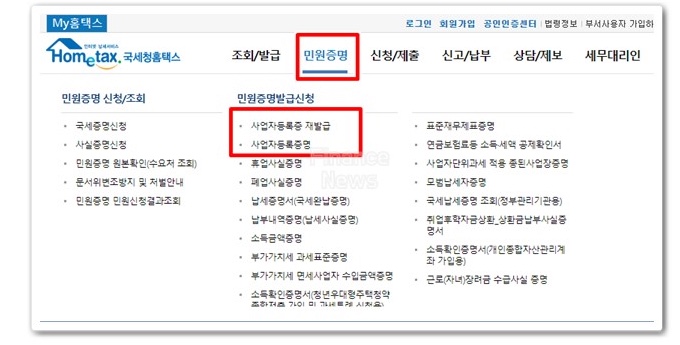 1. 민원증명 선택: 메뉴에서 ‘민원증명’을 선택한 후 ‘사업자등록증 발급’을 클릭합니다.
