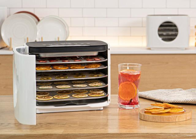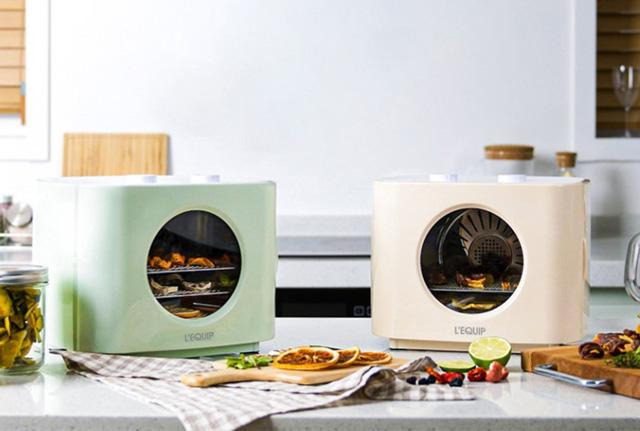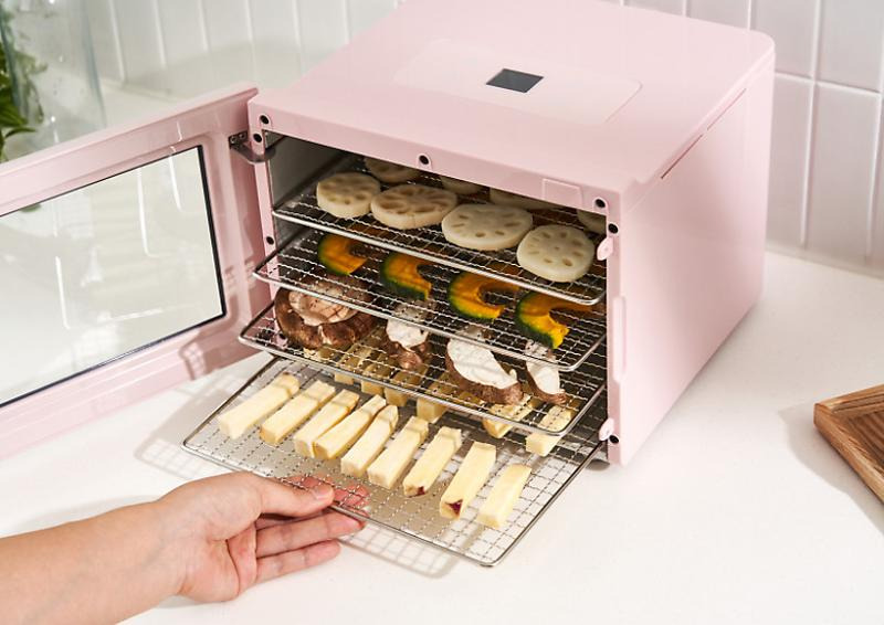레이를 탑재해 한꺼번에 많은 양의 식품을 건조시킬 수 있는 제품이다. 재료의 부피에 따라 두 가지의 높 이로 활용할 수 있는데, 낮게 트레이를 쌓을 경우에는 높이가 14 cm 까지 줄어든다. 속이 훤히 보이는 투명 트레이를 적용해 건조되는 과정을 직관적으로 볼 수 있으며, 온도와 시간을 바로 조절할 수 있다. 본 제품 의 공식몰 판매가는 58,960원이다.