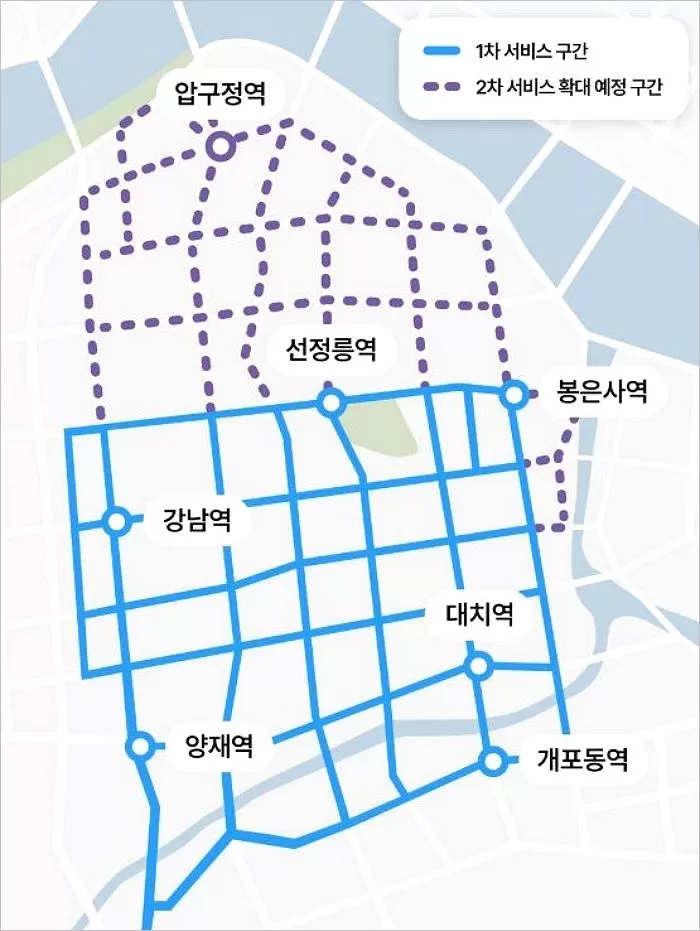 운행 지역: 강남구 역삼동, 대치동, 도곡동, 삼성동과 서초구 서초동 일대