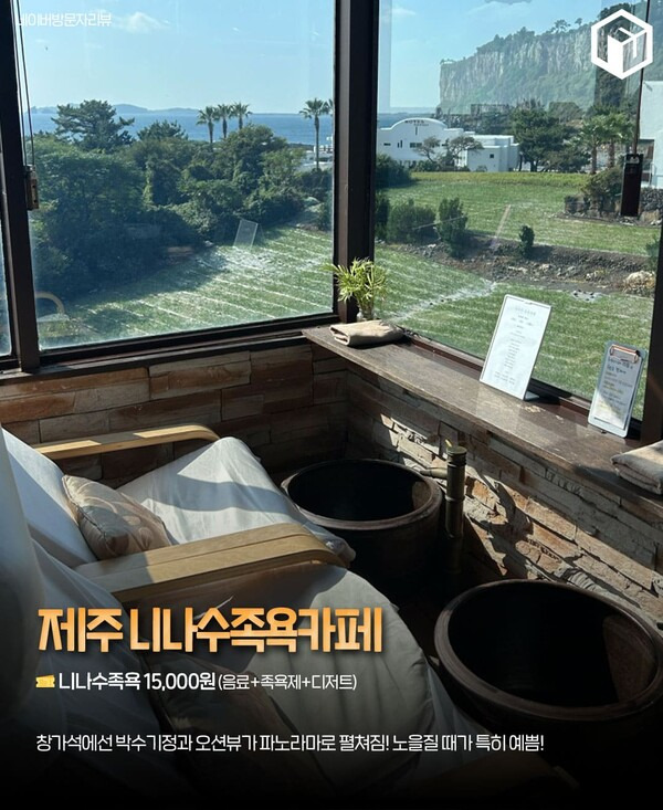 제주도 바다와 웅장한 박수기정을 파노라마로 감상하며 족욕까지 즐길 수 있는 니나수족욕카페입니다. 서귀포시 안덕면 조용한 해안마을에 자리하고 있어 제주 여행 중 쌓인 피로를 풀어내기에는 제격인 곳인데요. 음료와 족욕제, 디저트가 포함된 족욕 이용 요금이 15,000원으로 합리적이기까지 합니다.