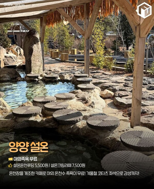 온천장을 개조한 양양 설온은 겨울 이색 체험을 모두 즐길 수 있는 족욕 카페입니다. 겨울철 창가 자리에는 따뜻한 코타츠가 설치되어 창밖으론 설경을 감상하며 감성적인 시간을 만끽할 수 있는데요. 야외 정원에는 온천수 족욕장을 마련해두어 겨울철 위는 시원하게, 아래는 따뜻한 온천 족욕을 무료로 즐길 수 있습니다.