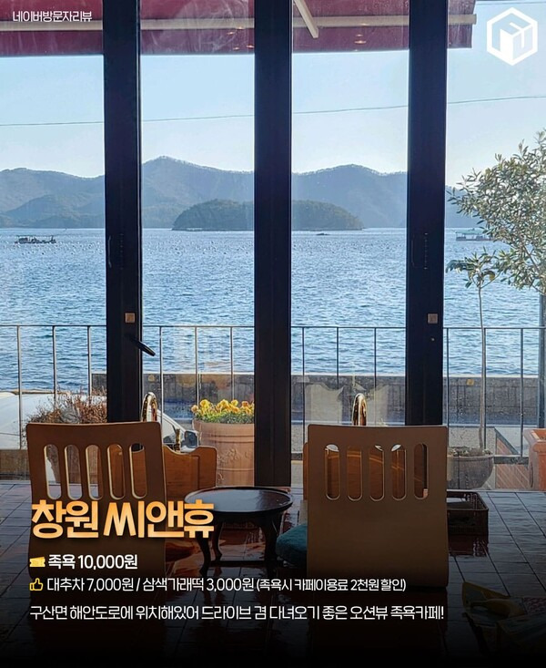 마산의 반짝이는 바다가 펼쳐지는 구산면 해안도로에 위치한 족욕카페 씨앤휴입니다. 창가를 따라 족욕 좌석이 마련되어 있어 여름에는 창을 열고 바닷바람을 느끼며 족욕을 즐길 수 있기도 한데요. 겨울이면 청명한 하늘과 바다를 바라보며 따뜻한 족욕시간을 보낼 수 있습니다.