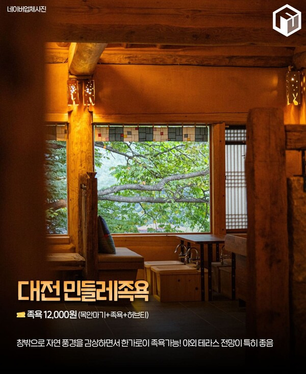 대전 옛터에 위치한 민들레족욕은 주변이 온통 산으로 둘러싸여있어 한가로운 시간을 즐길 수 있는 족욕카페입니다. 옛스러운 인테리어로 이루어진 카페에서는 일행들과 마주앉아 족욕을 즐길 수 있는데요. 족욕과 함께 목을 풀어낼 수 있는 안마기가 제공되며, 향긋한 허브티까지 12,000원의 가격으로 이용이 가능합니다.