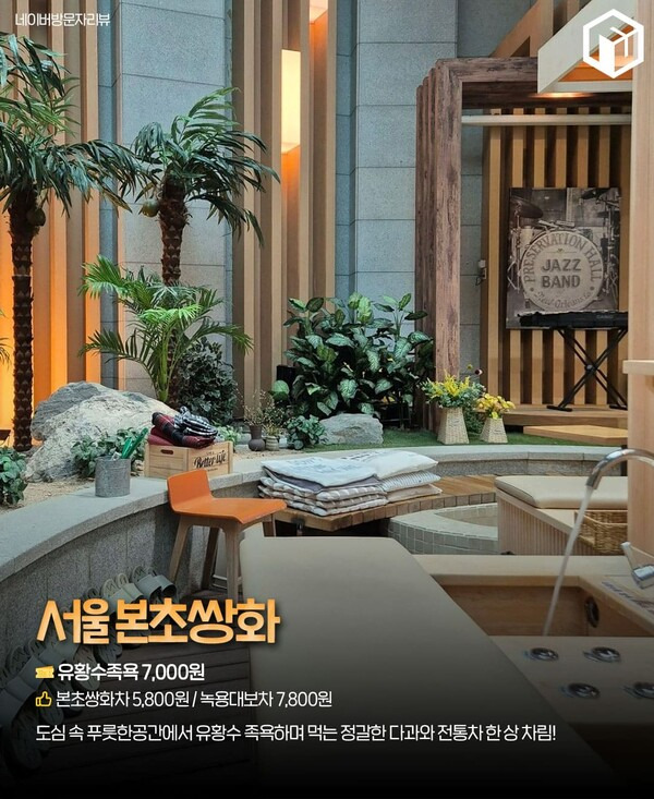 서울 도심 속에서 온전한 힐링을 만끽할 수 있는 본초쌍화입니다. 지하 2층에 위치해있지만 높은 층고와 푸릇한 플랜테리어 인테리어로 조성되어 마치 야외 정원에서 족욕을 즐기는 듯한 착각이 일기도 하는데요. 유황수 족욕은 1인 7천원이며 1인 예약시 부득이하게 다른 손님과 함께 이용하게 될 수 있는 점을 참고하셔야겠습니다.