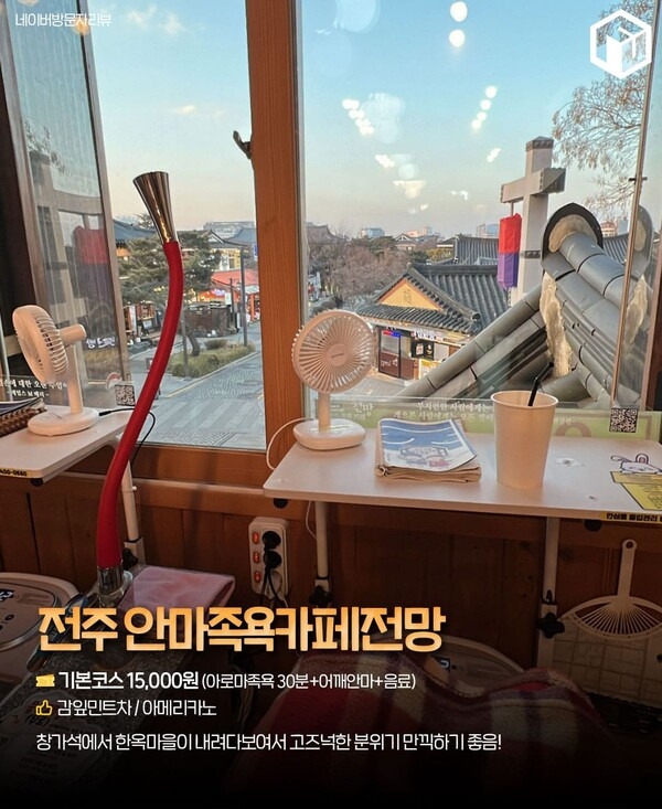 주요 관광지가 모여있어 뚜벅이 여행지로 추천하는 전주의 한옥마을에는 한옥마을 전경을 내려다보며 족욕을 즐길 수 있는 안마족욕카페전망이 위치해있습니다. 하루종일 여행하며 지친 발과 몸의 피로를 고즈넉한 분위기 속에서 풀어낼 수 있는 족욕 카페이죠.