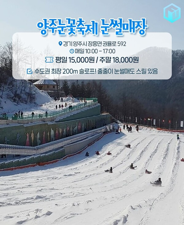 수도권 최장길이 200m의 눈썰매 슬로프가 있는 양주 눈꽃축제 눈썰매장입니다. 눈꽃축제장 내 조성된 눈썰매장에서는 줄줄이 눈썰매, 유아전용눈썰매, 전통얼음썰매, 빙어잡기 체험 등 다채로운 체험프로그램을 즐길 수 있는데요. 특히 성인들은 일반 눈썰매와 줄줄이 눈썰매를 탑승해 스릴을 만끽할 수 있습니다.