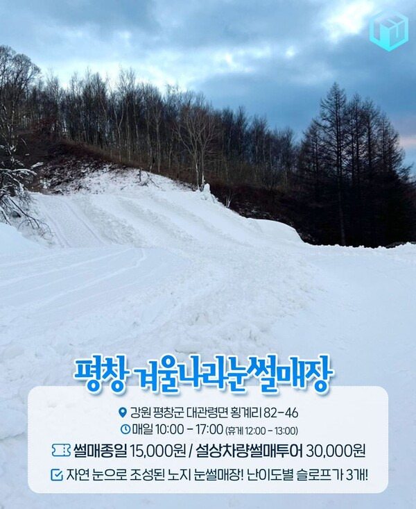 국내에서 거의 유일하게 자연 눈으로만 운영되는 노지 썰매장입니다. 슬로프는 총 3개로, 넓은 언덕을 개조한 눈썰매장인만큼 내년 슬로프의 구성이 달라지는데요. 2025년에는 이름을 바꿔 '겨울나라 눈썰매장'으로 운영하며, 현장 예매만 가능합니다.,