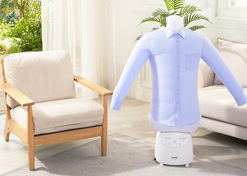 뉴메이슨 에어론 의류관리기도 옷을 입히는 형태로 사용할 수 있는 제품이다. 상의, 외투는 물론 바지도 건조시키고 관리할 수 있다. 기계에서 열풍을 방출하 고, 수많은 에어홀로 이를 분사해 구겨진 옷을 펴는 방식이다. 30분간 작동할 시에는 푹 젖은 옷을 98.