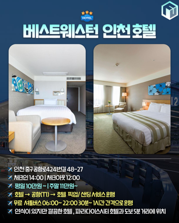 베스트웨스턴 프리미어 인천 에어포트 호텔은 인천국제공항과 인접해 있는 4성급 호텔로 연식이 오래되었지만 깔끔하다는 후기가 많은 호텔입니다. 호텔 내에는 피트니스 센터, 비즈니스 센터, 레스토랑 또 24시간 편의점까지 다양한 부대시설을 제공합해 편안하게 투숙을 즐길 수 있는 호텔이죠.