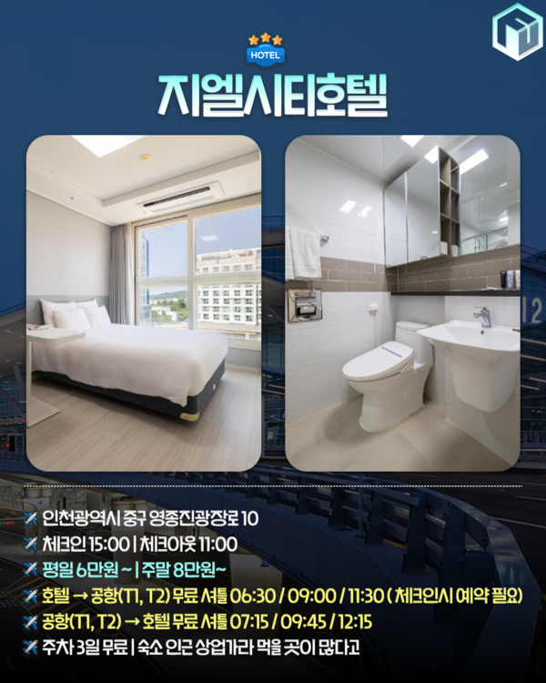 마지막으로 추천드릴 호텔은 지엘시티호텔입니다. 지엘호텔은 평일 6만원에 저렴한 가격으로 공항까지 무료 셔틀버스 서비스는 물론 3일 주차 무료 서비스도 제공하는 가성비 호텔입니다.