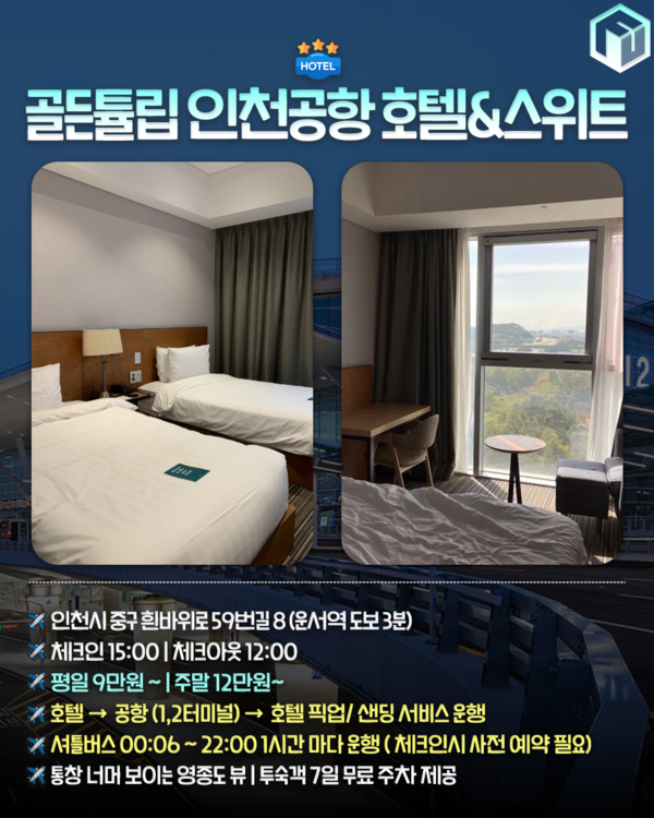 공항철도 운서역에서 도보 3분 거리, 객실 내 보이는 영종뷰가 매력적인 골든튤립 호텔은 평일 기준 9만원로 예약이 가능한 인천 공항 근처 가성비호텔입니다. 또한 무료 셔틀 버스도 운행해 인천공항 이용에 편리해 여행 전,후로 하룻밤을 보내기 좋은 호텔입니다.