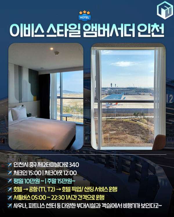 인천공항 2터미널 약 5분 거리에 위치해 객실에서 비행기 이착륙을 감상 가능한 이비스 스타일 앰버서더 인천에어포트입니다. 이비스 호텔은 특히 2터미널과 가까워 2터미널 이용 여행객분들께 추천드리는 호텔입니다.