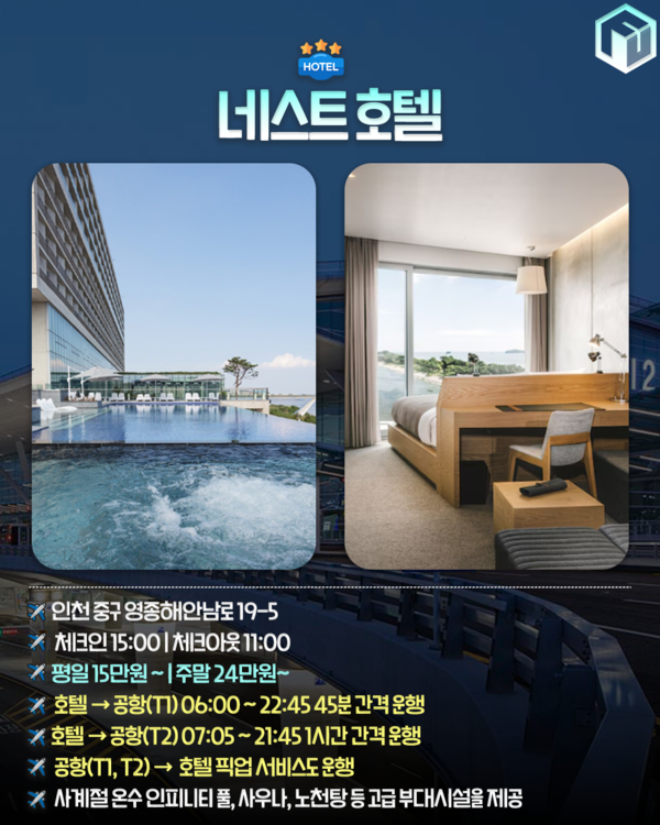 인천국제공항 인근 영종도에 위치한 5성급 호텔로 네스트호텔은 오션뷰와 마운틴뷰과 같은 탁 트인 전망과 다양한 부대 시설로 호캉스로도 인기있는 호텔입니다.특히 네스트 호텔은 사계절 온수 인피니티 풀, 사우나, 노천탕 등 고급 부대시설을 제공하는 럭셔리 호텔로 여행 전,후 여독을 풀고 싶은 분들께 추천드리는 호텔입니다.