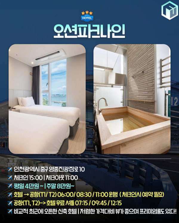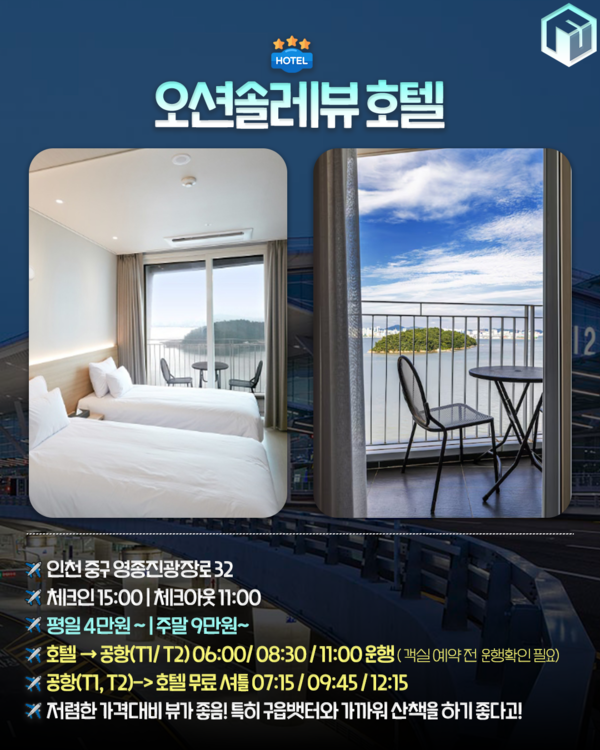 특히 평일 4만원 , 주말 9만원 가격에 공항 셔틀버스까지 운행을 해 인청공항 이용객이라면 가성비있는 호텔로 추천드립니다. 오션솔레뷰 호텔은 호텔에서 제 1터미널 ,2터미널 순으로 06:00, 08:30, 11:00 총 3회 운행을 합니다.