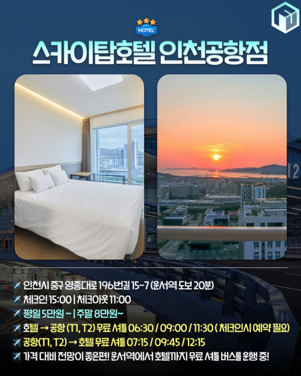 스카이탑호텔 인천공항점 인천공항까지 셔틀버스 서비스를 제공하고 있어 인천공항 이동이 편리한 호텔입니다. 다만 공항셔틀은 첫차는 6시 30분부터 하루에 3회 정도 운행되고 사전예약제로 객실 예약시 혹은 체크인 때 미리 전달하여야 합니다.