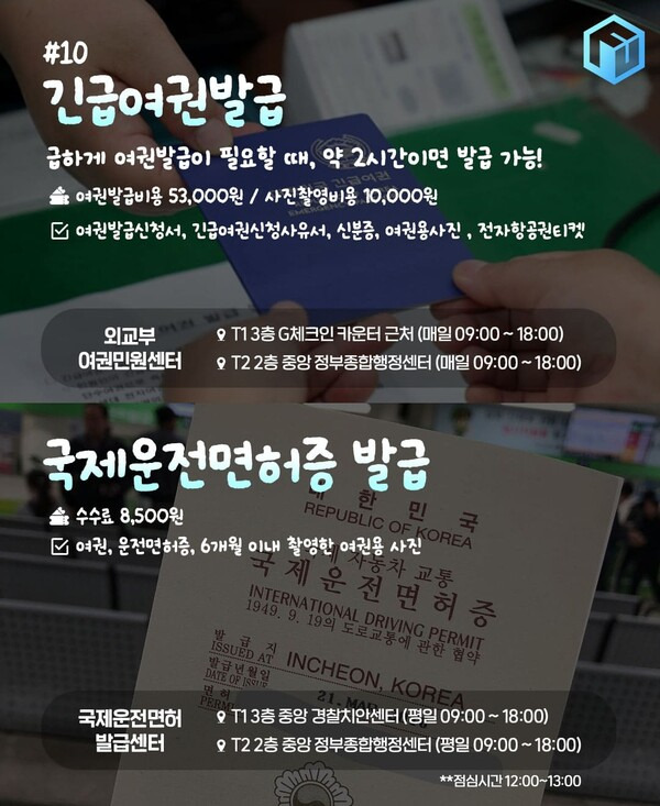 국제운전면허증은 사전에 발급받을수도 있지만, 미처 발급받지 못했다면 인천공항 터미널에서 발급이 가능합니다. 단, 평일 오전 9시부터 오후 6시까지만 발급이 가능하며 점심시간인 12시부터 1시까지는 접수 자체가 불가능한 점 참고하셔야겠습니다.