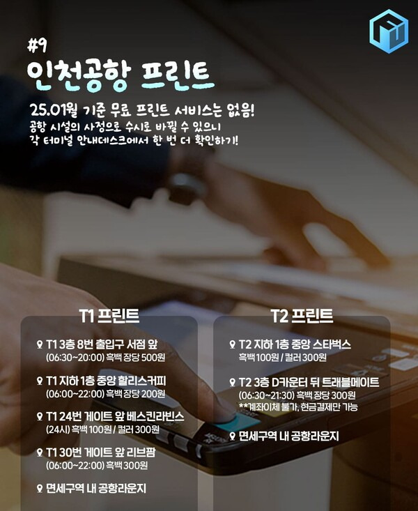 인천공항 1터미널에는 서점 앞, 할리스커피 매장 내에서 유료로 프린트 서비스를 제공하고 있으며 인천공항 24시간 프린트 가능한 곳은 현재 면세구역 24번 게이트 옆에 위치한 베스킨라빈스 매장 뿐 입니다.