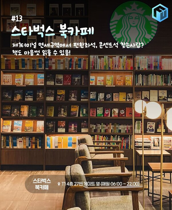 매장 내 책을 읽기 좋은 좌석이 여러개 마련되어 있으며 콘센트석, 책장 등이 있어 대기시간동안 책을 읽으며 시간을 때우기 좋아 추천하는 인천공항 꿀팁입니다.