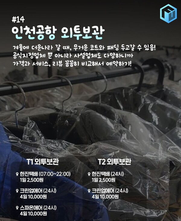 겨울에 따뜻한 해외로 여행을 간다면, 두꺼운 코트와 패딩이 짐이 될 수 있습니다. 여행기간동안 불필요한 짐과 외투를 보관할 수 있는 인천공항 외투보관 서비스는 공식지정업체와 사설 업체로 구분됩니다.