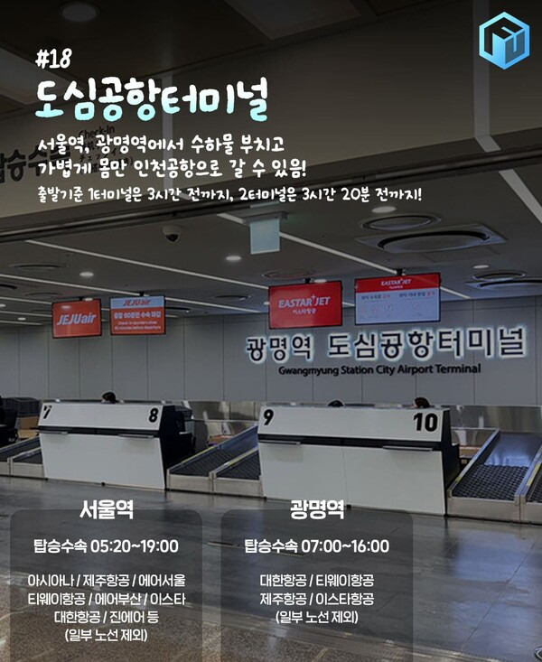 서울역과 광명역에서 인천공항으로 이동하는 분들이라면, 도심공항터미널을 이용해 보다 편리한 이동이 가능합니다. 이용하는 항공사에서 도심공항터미널 탑승수속을 지원하는 경우, 각 역에서 출발하는 공항직통 열차 및 버스를 예매한 경우에만 활용할 수 있는 인천공항 꿀팁이죠.
